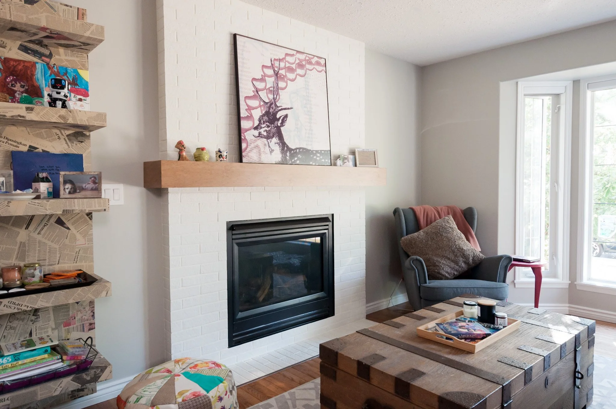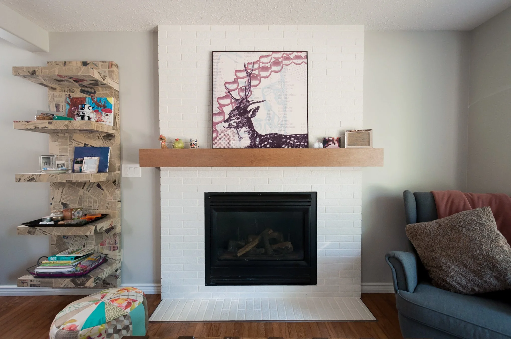 The fireplace went clean, classic and modern with white brick tile, the removal of the built up hearth, and the addition of a custom wood mantle. We still utilized the existing fireplace insert, and the end result was a more streamlined look which also gave space back to the room.