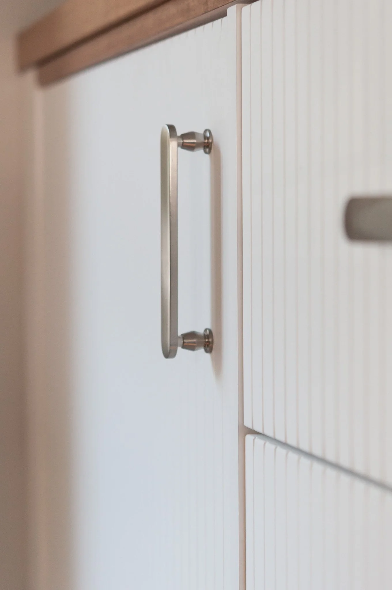 We chose a white deco fronts for additional texture, pairing them with sleek brushed nickel hardware that from the front mimics the texture of the cabinet doors, and also gives a little nod to the pill shaped tile in the bathroom upstairs. From the side they have extra detail that adds even more character.