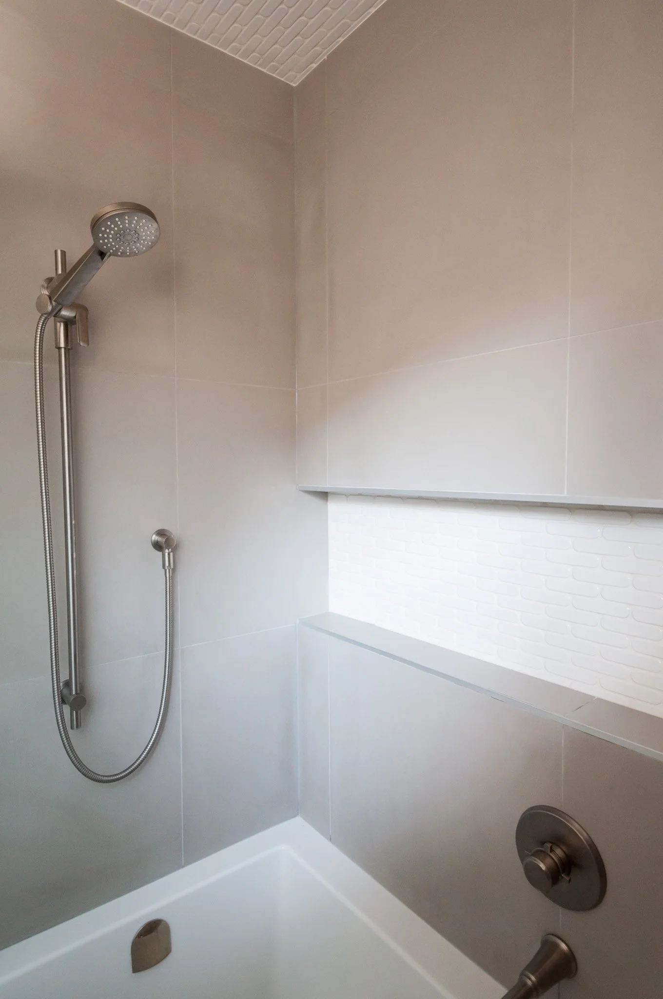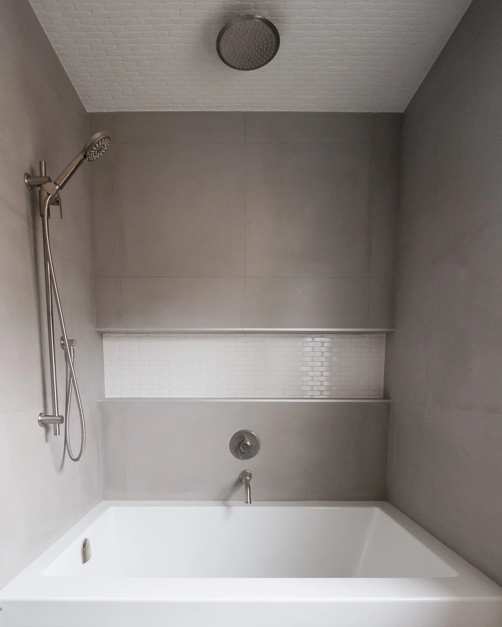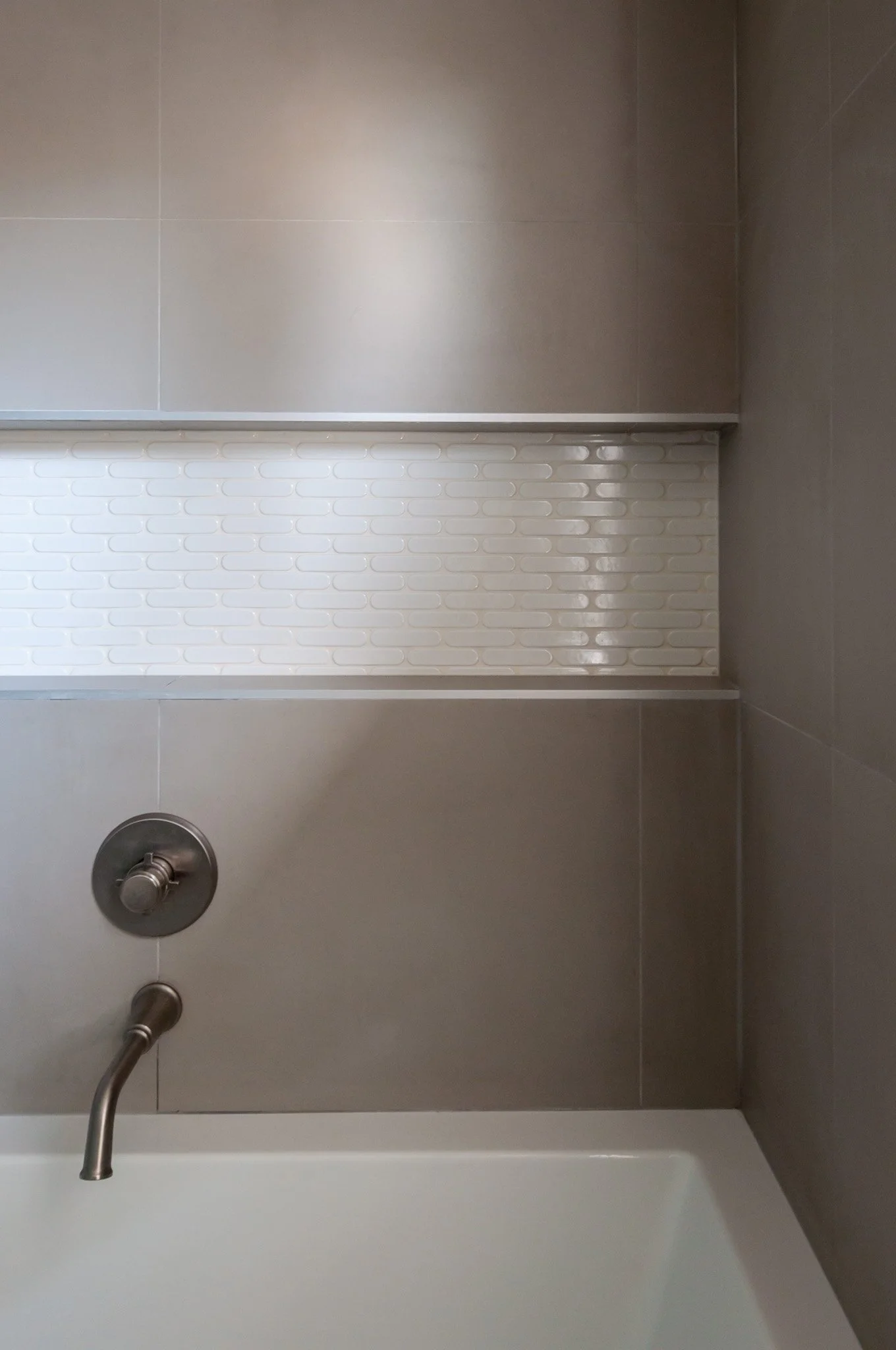We picked out large format gray tiles for the surround and a white pill-shaped mosaic to accent the niche and the ceiling. The only change from our initial design was the shower door, where our client wanted to go with a frosted glass instead of clear.