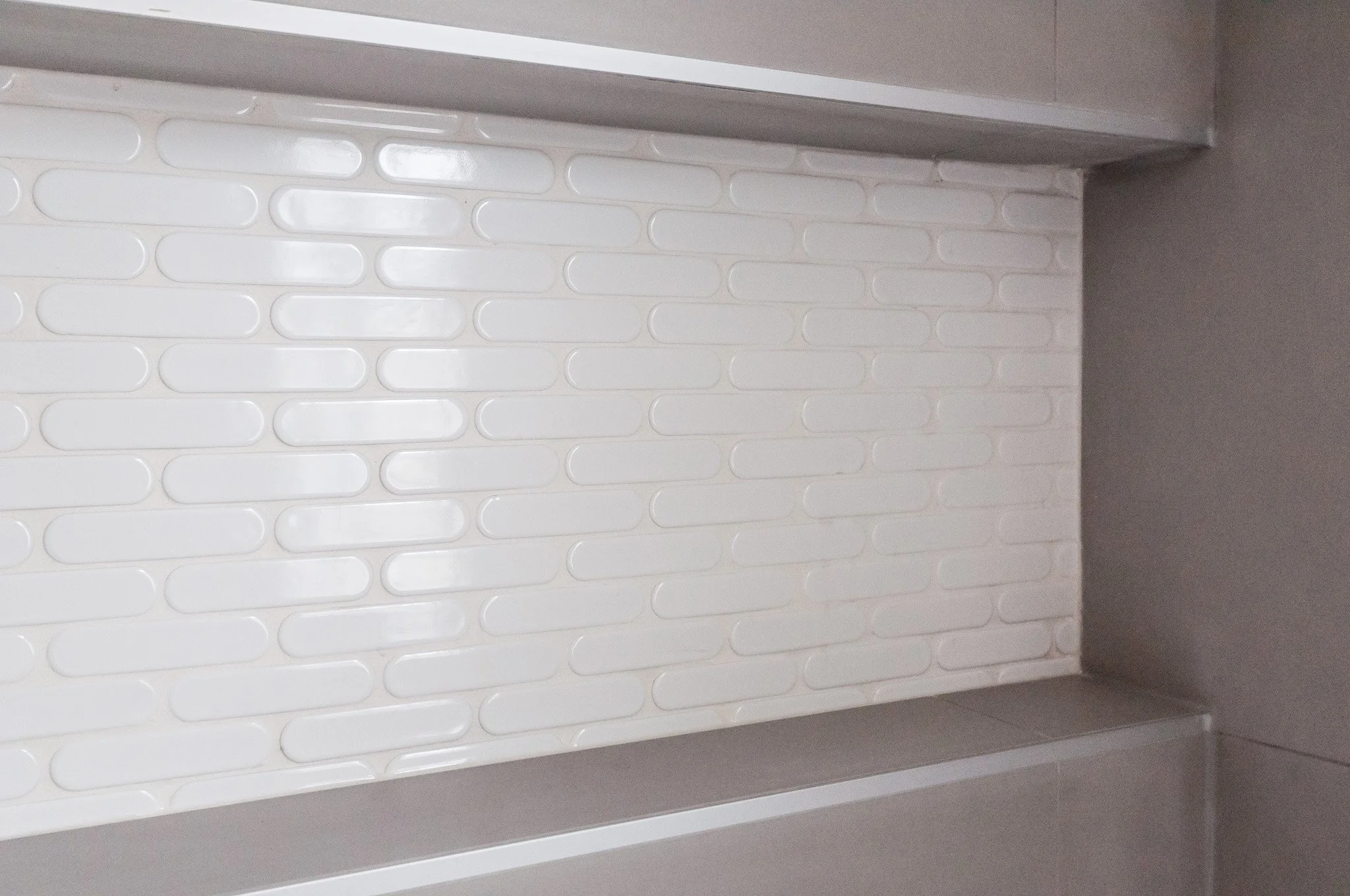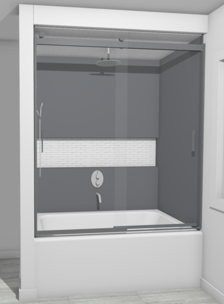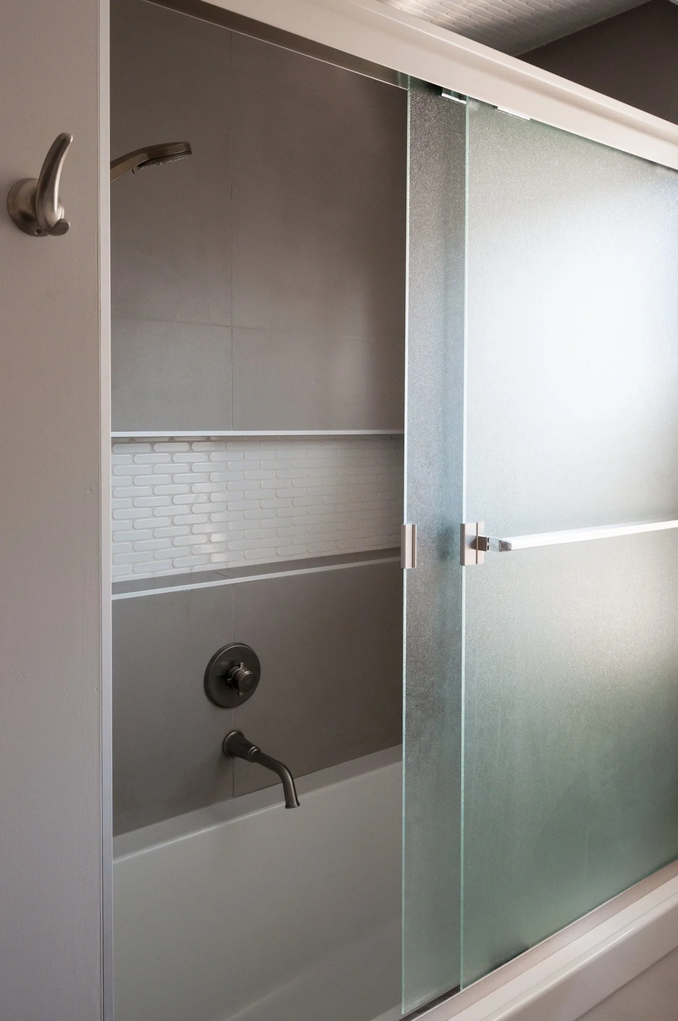 We picked out large format gray tiles for the surround and a white pill-shaped mosaic to accent the niche and the ceiling. The only change from our initial design was the shower door, where our client wanted to go with a frosted glass instead of clear.