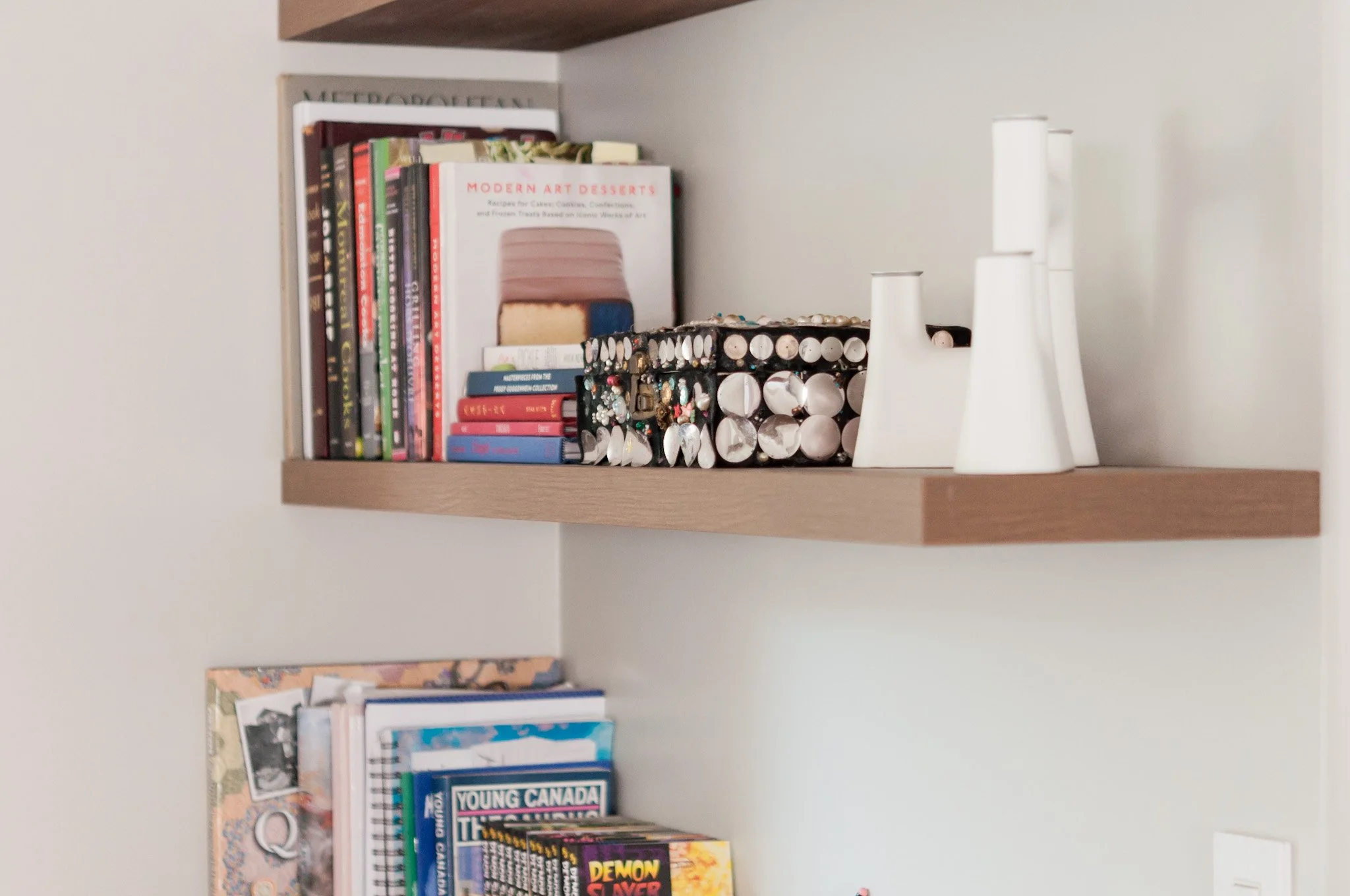The floating shelves finish off this area with more display and storage space for books, art and decor.