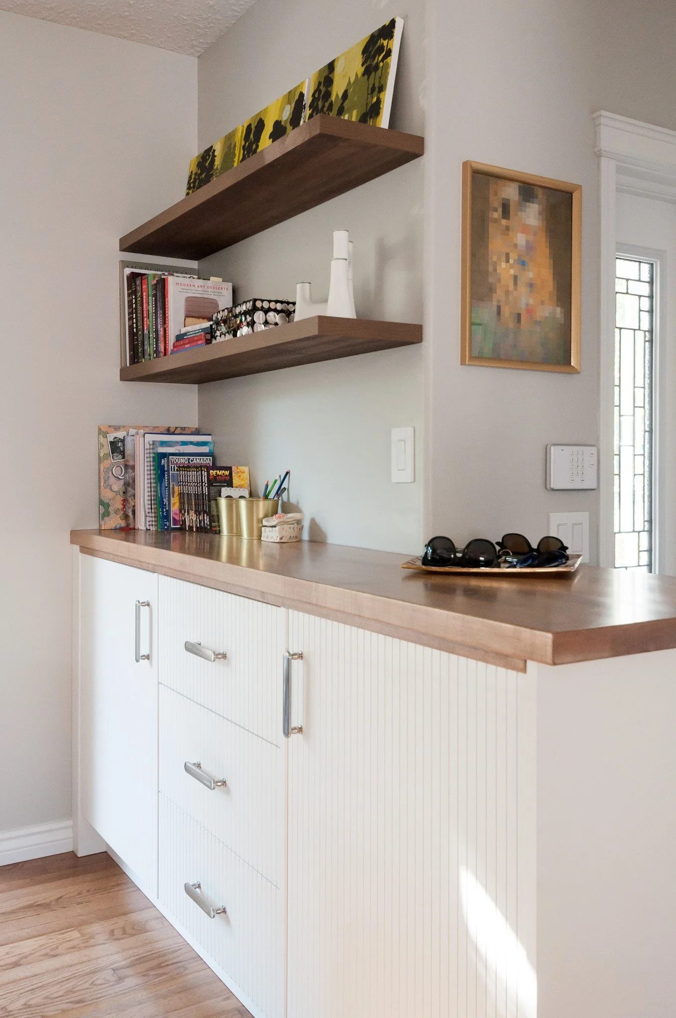 Upon entering the home, you’re greeted first with the new storage and countertop, incorporating the half wall between the entry and leading you from the entry and into the updated living room. Our clients told me that their guests who saw the space said it felt like it was always meant to be this way, which I love hearing!